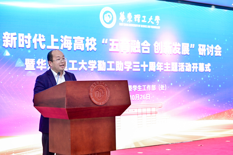 三十载勤工助学路,岁月如歌续新章。恰逢华东理工大学72周年校庆,学校勤工助学工作也迎来了30周年。10月26日,学校在奉贤校区隆重举行新时代上海高校“五育融合 创新发展”研讨会暨华东理工大学勤工助学三十周年主题活动开幕式。校党委副书记宋来、沈海涛,上海泰坦科技股份有限公司董事长兼首席执行官、全国五一劳动奖章获得者谢应波,贵州省人大代表、首届全国高校毕业生基层就业卓越奖获得者吴国邦,校友代表、教师代表、勤工助学学生代表等150余人出席了开幕式。开幕式由党委学生工作部(处)部(处)长崔姗姗主持。