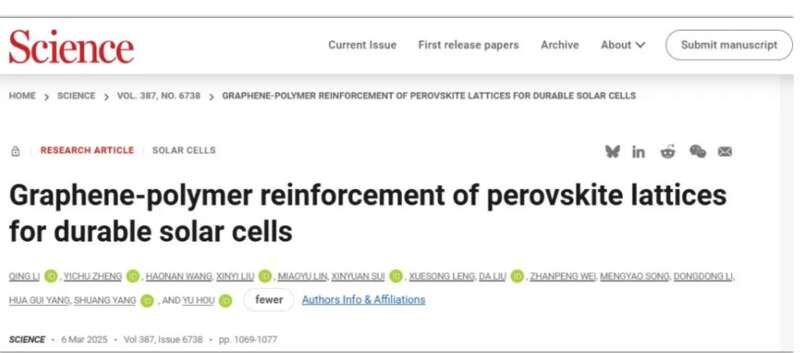 中国青年报客户端上海3月7日电(中青报·中青网记者 王烨捷)北京时间今天凌晨,华东理工大学材料学院清洁能源材料与器件团队侯宇教授、杨双教授等在《科学》杂志发表了题为“钙钛矿晶格的石墨烯聚合物增强,用于耐用的太阳能电池”的最新研究成果。