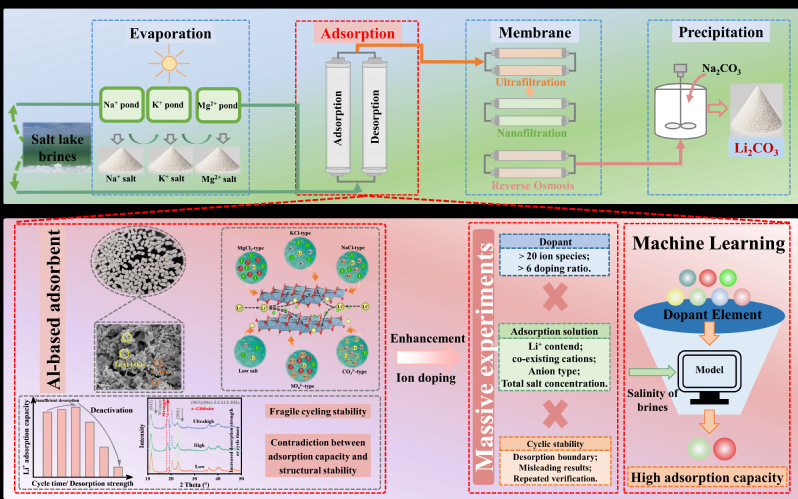 发展高效的盐湖提锂技术对实现锂资源的可持续供给意义重大。研究团队基于盐湖工业唯一应用的铝基锂吸附剂特性,提出了整合高通量实验和可解释机器学习技术(ML)的框架,完成其强化改性方案的快速筛选,避免了传统试错法带来的巨大工作量,实现在不同特性盐湖卤水中的吸附容量普遍提升约40%。相关研究工作以“Machine learning-accelerated design of high-efficient lithium adsorbents for salt lake brines”发表于Angew.Chem.Int.Ed.上,博士生张瑞与硕士生刘巳瑛为论文共同第一作者,练成教授与国家盐湖中心林森副教授为论文共同通讯作者。