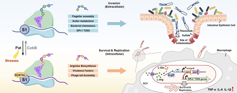 在该研究中揭示了一种新型的细菌毒力调控机制:鼠伤寒沙门氏菌通过动态调控核糖体蛋白S1的K247可逆乙酰化状态,实现翻译程序的精确重编程,从而适应宿主不同感染阶段的环境压力。研究证实,K247乙酰化由乙酰转移酶Pat和去乙酰化酶CobB动态调控。通过核糖体-新生肽链测序技术(RNC-Seq)分析,发现K247非酰基化状态倾向于结合鞭毛组装、硫代谢及SPI-1 T3SS相关mRNA,促进细菌早期侵袭能力;K247乙酰化则偏好性招募精氨酸合成及SPI-2相关mRNA,其中L-精氨酸可通过激活调控蛋白ArgR进一步上调SPI-2毒力因子的表达,从而增强细菌在巨噬细胞内的存活与复制能力。这一机制的发掘不仅阐明了病原菌利用翻译调控优化毒力表达的分子机制,也为开发针对核糖体翻译调控的新型抗菌策略提供了潜在靶点。