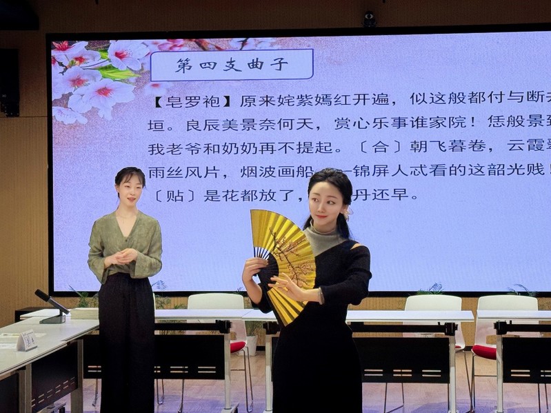 上戏戏文系党总支委员朱锦华教授从汤显祖的戏剧切入,自然聚焦到《牡丹亭》的“游园惊梦”。从第一支曲子【绕池游】的字词解析到第四支曲子【皂罗袍】的意境解读,朱老师如数家珍,展现出其深厚的文学底蕴和“金课”教师的授课风采。