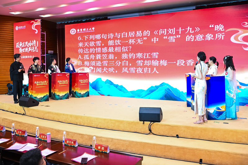 为深入学习贯彻习近平新时代中国特色社会主义思想,领悟习近平总书记关于坚定文化自信、建设文化强国的重要论述,5月20日,由校团委指导,商学院主办的第三届校园诗词大会总决赛于奉贤校区敬贤堂举办,师生共赏诗词经典,感悟千年文脉,在诗意中厚植文化自信。