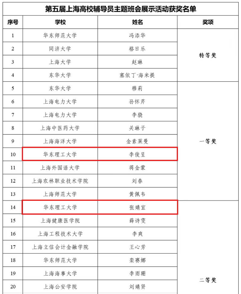 近日,由中共上海市教育卫生工作委员会、上海市教育委员会主办的第五届上海高校辅导员主题班会展示活动在东华大学举行。本次展示活动聚焦“锻造强大思政引领力,培养造就时代新人”主题,通过教案设计、命题说课、现场展示等多个环节,全面检验辅导员的大学生思想政治教育能力。经过激烈角逐,我校专职辅导员李俊呈获得一等奖,张婧宜获得二等奖,实现了我校在这一赛事上的新突破。