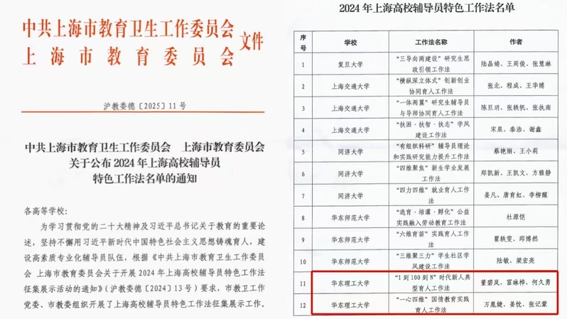 近日,《中共上海市教育卫生工作委员会 上海市教育委员会关于公布2024年上海高校辅导员特色工作法名单的通知》(沪教委德〔2025〕11号)中正式公布2024年度上海高校辅导员特色工作法名单。经学校推荐、材料审核、专家评审等环节,我校《“1到100到N”时代新人典型育人工作法》《“一心四维”国情教育实践育人工作法》两项工作法成功入选。