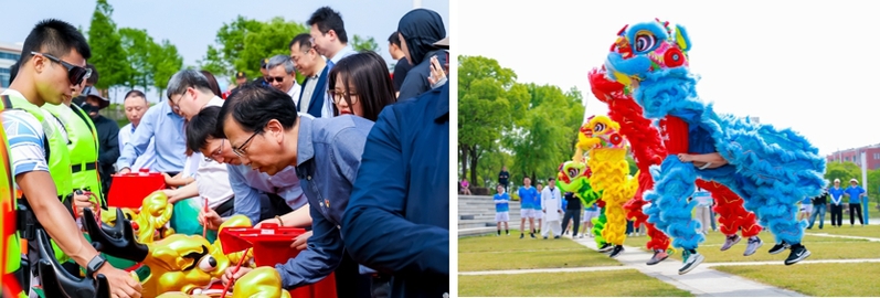 参赛队伍兴致勃勃地观看了学生舞狮队带来的精彩舞狮表演。各单位领导为龙舟点睛,为比赛赋予吉祥与活力。