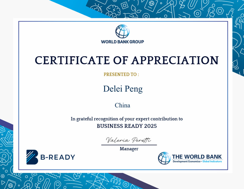 2024年,经世界银行内部专家遴选程序,彭德雷教授获邀进入营商环境评估项目,提供相关专题版块的问题反馈与解释工作。