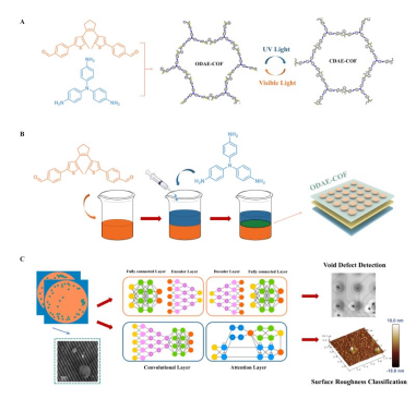 智能传感团队报道了一种大面积的刺激响应型共价有机框架薄膜(ODAE-COF),并以此薄膜材料为活性层制备了具有光电双响应特性的忆阻器,进一步开发了基于忆阻器的新型边缘计算系统。该系统集成了传感单元和数据处理模型,分别用于晶圆的空洞缺陷检测和表面粗糙度分类。传感单元模型包含两个网络:首先在图像增强网络中,利用忆阻器的光响应性进行去噪和特征提取;接着,信号被传输到一个由输入、编码器、解码器和输出模块组成的神经网络,用于精确定位缺陷。通过对400幅晶圆的X射线图像进行测试,证明了空洞缺陷检测的有效性。数据处理模型包含一个图像注意力模块、一个特征卷积模块和一个概率映射模块,所有模块均由64种光电导态的忆阻器构成。该模型在晶圆表面粗糙度分类中实现了优异的表现,平均精度超过90%。