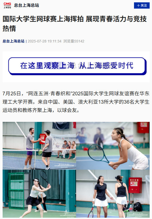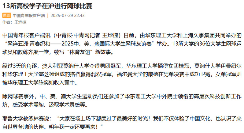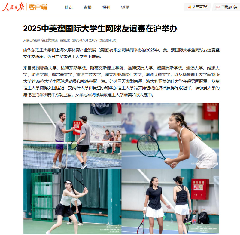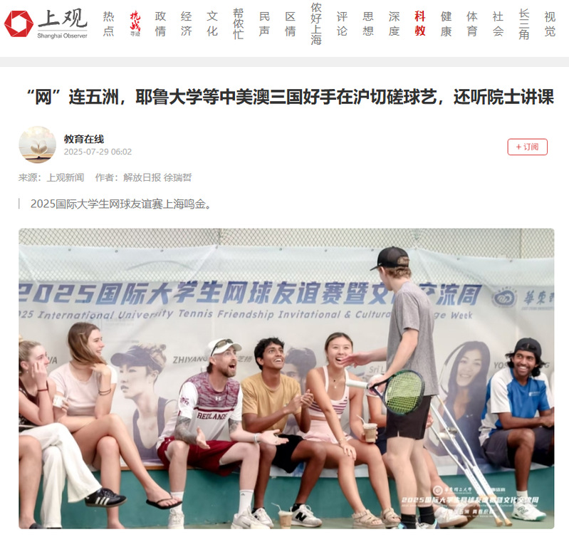 7月25日,由华东理工大学和上海久事体育产业发展(集团)有限公司共同举办的“网连五洲·青春织和——2025中、美、澳国际大学生网球友谊赛”在华东理工大学拉开序幕。来自美国耶鲁大学、达特茅斯学院、斯蒂文斯理工学院以及华东理工大学等13所大学的36位大学生网球运动员和教练齐聚一堂,续写“体育友谊”新故事。央视新闻客户端、人民日报客户端、光明日报客户端、CHINA DAILY、中国新闻网、中国青年报客户端、解放·上观、东方网、SHANGHAI DAILY、上海教育新闻网、第一教育、劳动观察、新民周刊、话匣子等10余家媒体进行了原发报道。本篇选取部分报道予以转载。