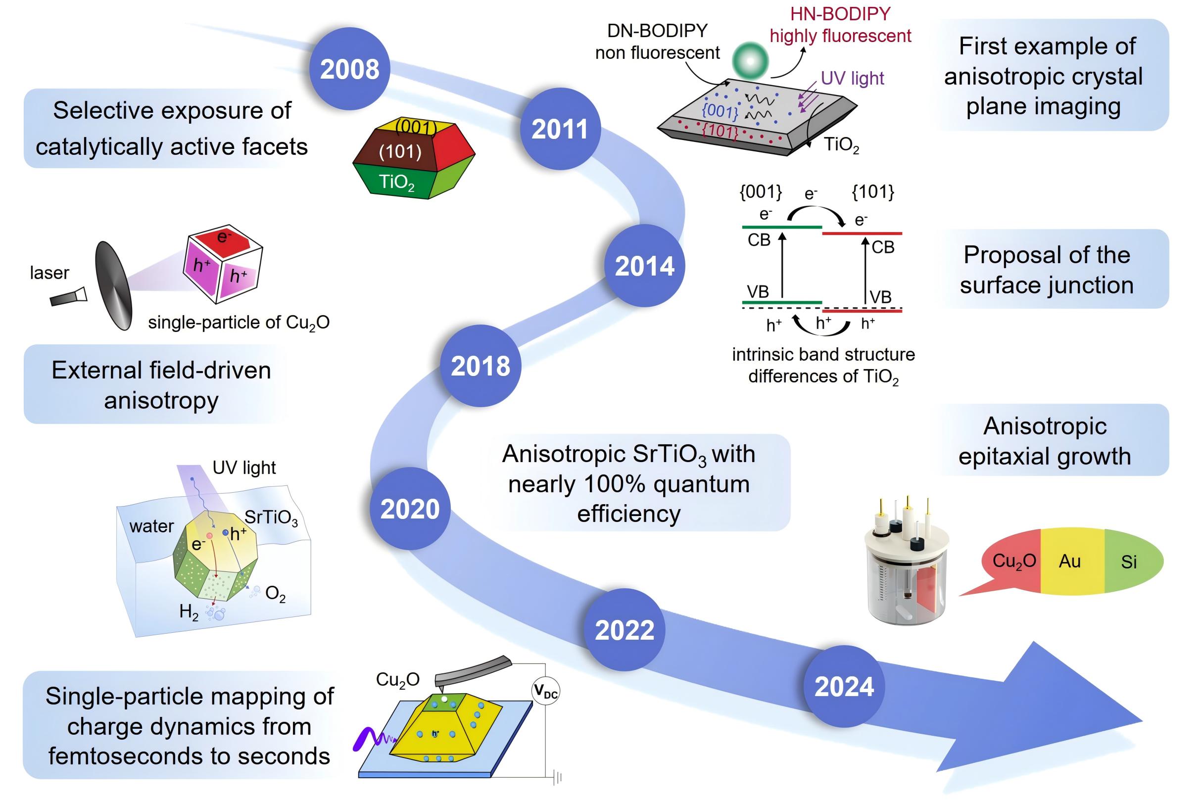 2008年,杨化桂首次提出无机非金属离子调控晶态半导体取向生长理论,开创了基于晶面各向异性结构设计光(电)催化材料的研究范式。而后十几年间的系列研究表明,晶体各向异性广泛影响光吸收能力、光生载流子迁移路径、表面活性位点分布及关键中间体吸附与转化机制,仅依赖材料的整体组成或宏观结构已难以准确预测其光(电)催化行为。同时,单晶材料在界面结构设计、晶面精确调控及器件集成兼容性等方面仍面临诸多挑战。