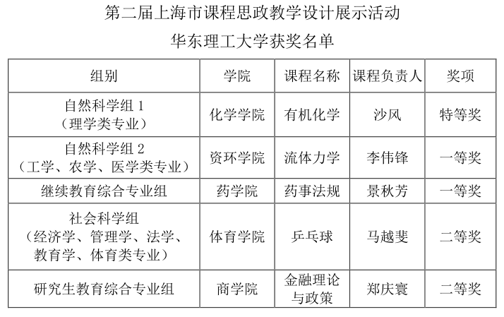 日前,第二届上海市课程思政教学设计展示活动获奖名单公布。180位教师脱颖而出,其中,特等奖36项、一等奖54项、二等奖90项,优秀组织奖10项。华东理工大学喜创佳绩,夺得特等奖1项、一等奖2项、二等奖2项,遴选推荐的5位教师全部获奖,学校获评优秀组织奖。