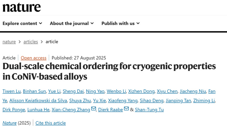 8月28日凌晨,华东理工大学机械与动力工程学院张显程教授、涂善东院士团队在Nature(《自然》)发表题为“Dual-scale chemical ordering for cryogenic properties in CoNiV-based alloys”的最新研究成果。