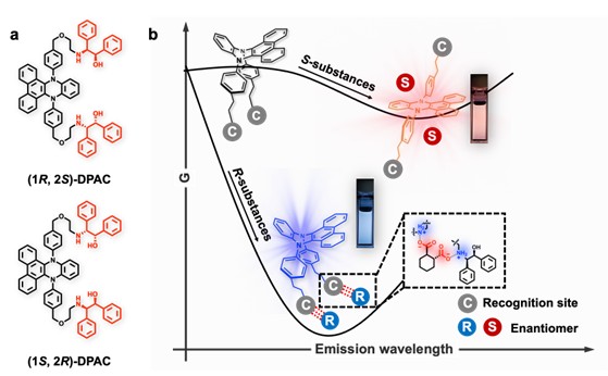 手性是自然界赋予分子的“镜像”属性,也是药物、农药、食品添加剂能否发挥预期作用、避免毒副作用的重要因素之一,因此,精确识别对映体并开发相应分析技术尤为重要。基于发光检测技术具有简便、快速以及实时监测等优点,其核心挑战在于利用染料与对映异构体之间的差异性相互作用,精确调节其发射能级,实现对映体的高灵敏度区分。近日,我校化学与分子工程学院田禾院士、马骧教授团队在功能染料手性识别领域取得重要进展,相关研究成果发表于《自然-通讯》(Nature Commun. 2025, 16, 7788)。