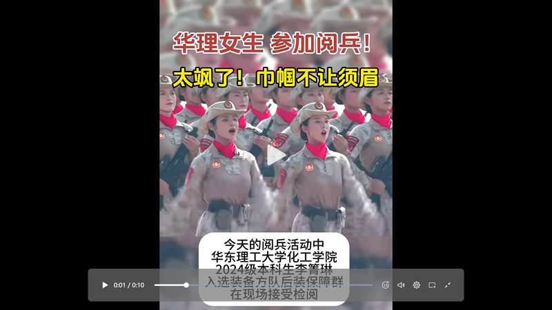 9月3日,华东理工大学化工学院2024级本科生李菁琳凭借优异表现入选装备方队后装保障群,在阅兵现场接受检阅。