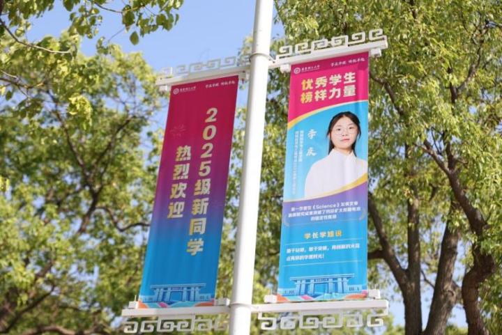 本次迎新季,华东理工大学在校园主干道两侧布设近百面“华理学子·榜样力量”主题道旗,聚焦学术科研、创新创业、社会实践、文体竞赛等领域的优秀学子,以人物风采展示和“学长学姐说”的温暖寄语,为新生打造了可感、可学的榜样标杆。