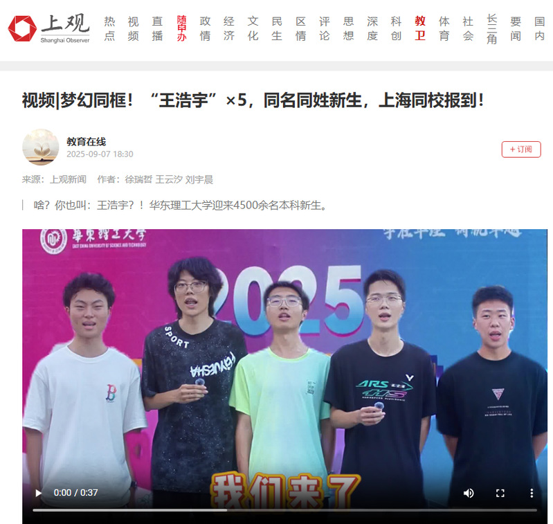 【解放·上观】梦幻同框!“王浩宇”×5,同名同姓新生,上海同校报到!