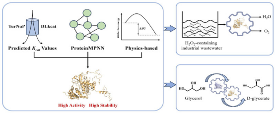 团队针对模块I的限速步骤,引入计算辅助的酶工程策略,通过AlphaFold3结构预测、ProteinMPNN序列设计与能量打分筛选,从嗜热菌来源过氧化氢酶出发,获得了四突变体D78P/K201R/E384Y/T435A。该变体酶活提升1.9倍,Tm值提升8°C,半衰期提高5倍延长至145小时,打破了活性与稳定性之间的权衡限制,实现模块I甘油酸产率显著提升。此外,变体在医疗废水、纺织漂洗液、乳品加工液等体系中,表现出对H2O2显著优于商品酶的处理能力,反应时间缩短50%。该研究不仅为ncAAs绿色合成提供了优选元件,也为甘油高值利用和工业废水处理开辟了可持续发展的新路径。