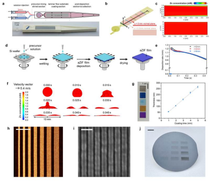 基于前期超稀释前驱体溶液赋能化学液相沉积法制备aZIF薄膜的策略(Nature Materials, 2023),研究团队提出了一种间歇性旋涂化学液相沉积制备aZIF薄膜的方法,实现了可控的薄膜沉积速率和厚度(几纳米到几百纳米)。为了量化流体力学、传递现象、薄膜沉积动力学耦合中复杂的工艺参数对薄膜沉积的影响,从而指导大尺寸基底(8/12英寸晶圆)光刻胶的均匀可控涂覆。研究团队首先通过3D打印的微搅拌连续流反应器,结合薄膜沉积实验、传递现象分析和计算流体力学模拟,得到了薄膜沉积的本征速率,然后根据旋涂实验和仿真结果验证了薄膜沉积动力学,最终揭示了薄膜沉积均匀性的关键影响因素。