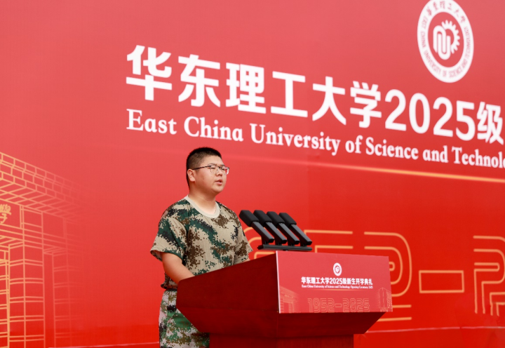 首届全国新时代青年先锋奖、2025年上海市“申教名匠”获得者、化学学院张琦教授作为教师代表发言。他与新生们分享了自己在华理十载求学与任教经历,鼓励新生们秉承“勤奋求实,励志明德”校训精神,珍惜同窗情谊,敢于试错、追求真理,在科学探索中书写新时代华理人的励志篇章。