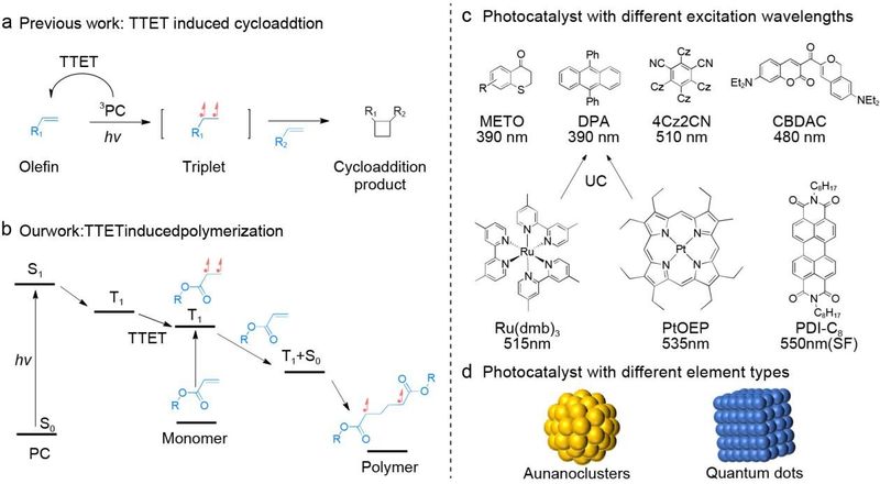 该团队将能量转移诱导环加成反应的设计思路应用于光诱导聚合反应中,将常见的聚合单体(如甲基丙烯酸甲酯)等作为能量转移受体,以其三重态作为聚合反应的起点,实现了双组分聚合;并结合磷光发射光谱、瞬态吸收光谱、时间分辨-电子顺磁光谱和对照实验等阐明了其反应机理,说明了三重态能量转移过程与该聚合反应的紧密联系。团队还将该体系的光催化剂范围从常见有机分子拓展到金纳米簇、量子点等无机材料,证明了其应用的普适性。本工作为光诱导聚合反应提出了全新的独特机制,为高分子合成开辟了新途径。