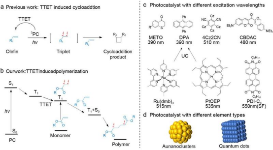 该团队将能量转移诱导环加成反应的设计思路应用于光诱导聚合反应中,将常见的聚合单体(如甲基丙烯酸甲酯)等作为能量转移受体,以其三重态作为聚合反应的起点,实现了双组分聚合;并结合磷光发射光谱、瞬态吸收光谱、时间分辨-电子顺磁光谱和对照实验等阐明了其反应机理,说明了三重态能量转移过程与该聚合反应的紧密联系。团队还将该体系的光催化剂范围从常见有机分子拓展到金纳米簇、量子点等无机材料,证明了其应用的普适性。本工作为光诱导聚合反应提出了全新的独特机制,为高分子合成开辟了新途径。