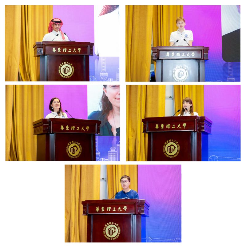 5位来自不同国家的新生代表依次上台发言。沙特阿拉伯的尤瑟夫、斯洛文尼亚的扎克、巴西的朱安莲、法国的维琳以及2025级001号录取通知书获得者中国学生王海昊,分别分享了他们选择华理的理由、对专业的热情以及对未来的憧憬。