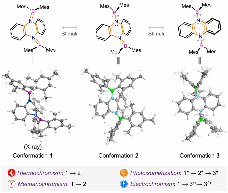 智能分子能够通过感知并响应外部刺激实现“智能化”。然而,大多数智能分子仅能对单一的刺激产生简单的二元响应。为了提高分子的刺激响应性,田禾院士团队将具有动态键级的B-N键和可变芳香性的二氢吡嗪环结合,设计并合成了一种新型动态分子5,10-二(三甲苯基)硼基-5,10-二氢吩嗪(BNNB)。该分子融合了B-N键的扭转和二氢吡嗪环的平面化运动性质,表现出可逆的三级构象转变,并对光、电、热以及机械力展现出构象驱动的多重刺激多级响应特性。值得注意的是,分子构象的动态演变可诱导吸收与荧光性质的显著变化,呈现出肉眼可见的热致变色、机械变色与电致变色行为,并可激活TADF和三重荧光发射。这些结果展现了一种新的多重刺激多级响应集成策略,以超越传统的单一刺激二元响应智能分子,并使未来基于单分子设计多功能集成的多模态响应系统成为可能。