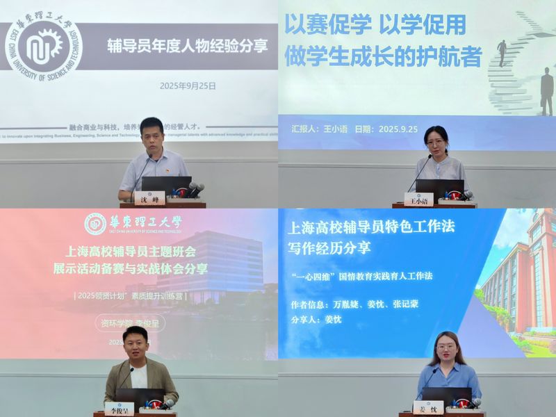 经验分享环节,历届队伍建设月获奖代表进行了交流发言。2020年上海高校辅导员年度人物沈峰提出,辅导员应勤于思考、善于总结,既要成为懂理论的实践者,也要做会实践的理论者;2024年上海市辅导员素质能力大赛特等奖获得者王小语围绕学情分析、谈心谈话、案例研讨、主题宣讲等竞赛关键环节分享了心得;2024年上海高校辅导员主题班会展示活动一等奖获得者李俊呈就主题遴选、备课说课、现场展示等环节交流了备赛经验;2024年上海高校辅导员特色工作法《“一心四维”国情教育实践育人工作法》作者姜忱从内容构思、框架搭建到修改完善,全面介绍了撰写经验。