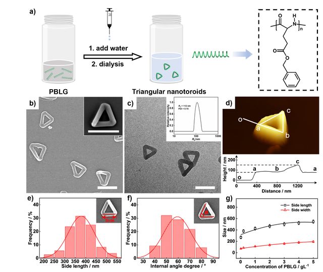 针对这一挑战,研究团队通过聚肽均聚物聚(γ-苄基-L-谷氨酸酯)(PBLG)的溶液自组装制备得到了三角形纳米环。通过对三角形纳米环边长和角度的统计,其近似于一个等边三角形。三角形纳米环并非平面结构,其边的高度变化表明了该结构具有右手手性。三角形纳米环的手性与PBLG聚合物的手性特性有关。在类似的实验条件下,PBDG(PBLG的对映体)可以形成具有左手性的三角形纳米环。