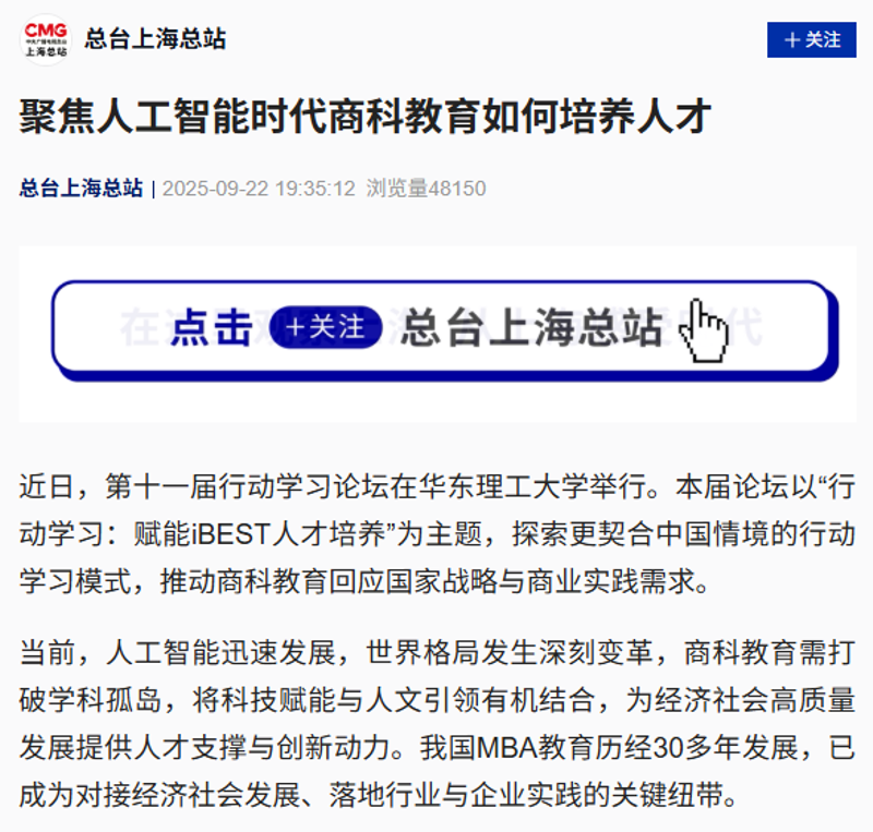 9月19日,第十一届行动学习论坛在华东理工大学开幕。本届论坛以“行动学习:赋能iBEST人才培养”为主题,旨在探索更契合中国情境的行动学习模式,为新时代商科人才培养注入澎湃动能。央视新闻客户端、光明日报客户端、中国日报网、中国社会科学网、中国新闻网、科学网APP、新民·上观、东方网、劳动观察、上海教育新闻网、上海科技报、第一教育、话匣子、上海徐汇、广州日报新花城等10余家媒体进行了原发报道。本篇选取了部分报道予以转载。