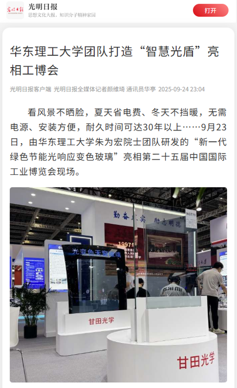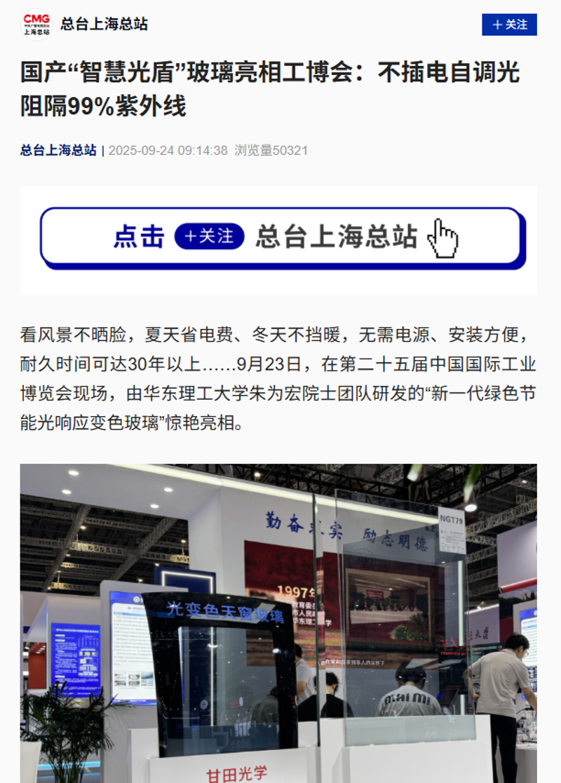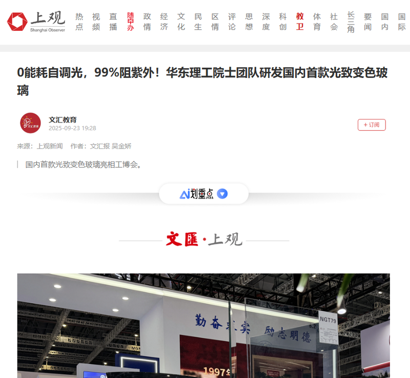 【文汇·上观】0能耗自调光,99%阻紫外!华东理工院士团队研发国内首款光致变色玻璃