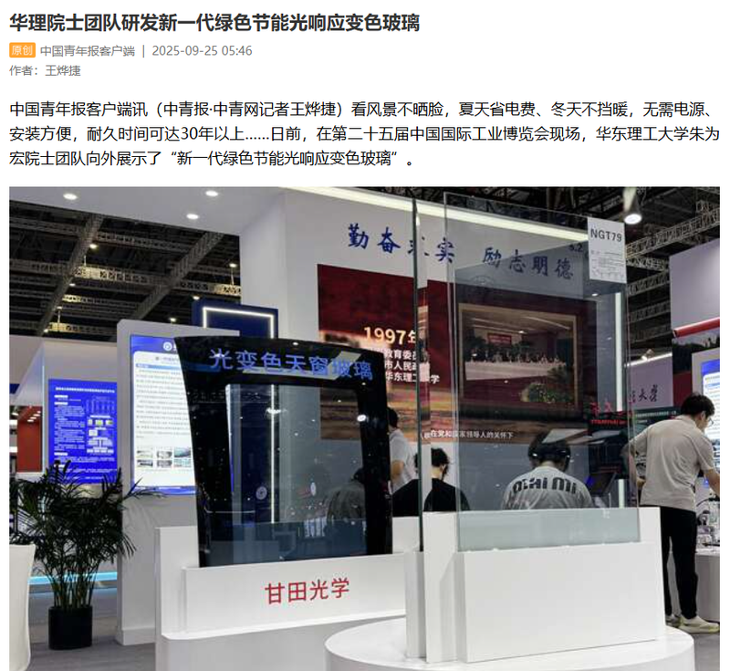 中国青年报客户端讯(中青报·中青网记者王烨捷)看风景不晒脸,夏天省电费、冬天不挡暖,无需电源、安装方便,耐久时间可达30年以上……日前,在第二十五届中国国际工业博览会现场,华东理工大学朱为宏院士团队向外展示了“新一代绿色节能光响应变色玻璃”。