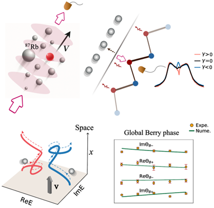图片说明:原子系综和驻波光场相互作用、非厄米晶格模型,以及全局Berry相位理论模拟和实验测量结果