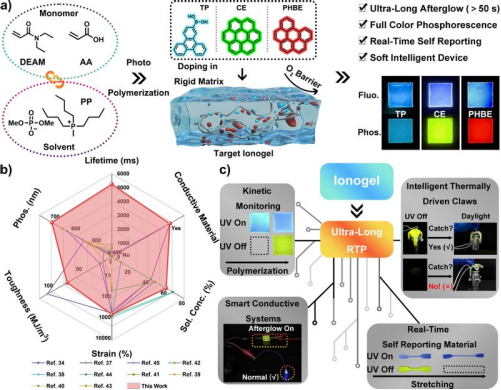 图片说明:a) 超长室温磷光离子凝胶的光聚合制备过程及性能示意图;b) 文章所报道的超长室温磷光离子凝胶材料与领域内同期报道材料的性能对比雷达图;c) 超长室温磷光离子凝胶材料用于智能监测应用的示意图。