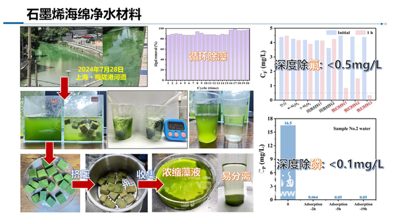 在众多研究项目的推进过程中,令邢明阳印象最深刻的是“石墨烯海绵净水材料”项目。自2017年起,邢明阳先后带领2名硕士生和2名博士生接力攻关,从材料设计、功能调控到实际应用验证,历时8年最终开发出一种可同步除氟、除磷、除藻的多功能海绵。