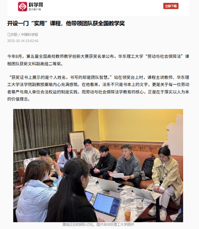 今年8月,第五届全国高校教师教学创新大赛获奖名单公布,华东理工大学“劳动与社会保障法”课程团队获新文科副高组二等奖。课程主讲教师、华东理工大学法学院副教授粟瑜始终认为,劳动与社会保障法学教育的核心,正是在于落实以人为本的价值理念。科学网APP、新民·上观、东方网、上海教育新闻网、上海科技报、第一教育等多家媒体进行了原发报道。本篇选取了部分报道予以转载。