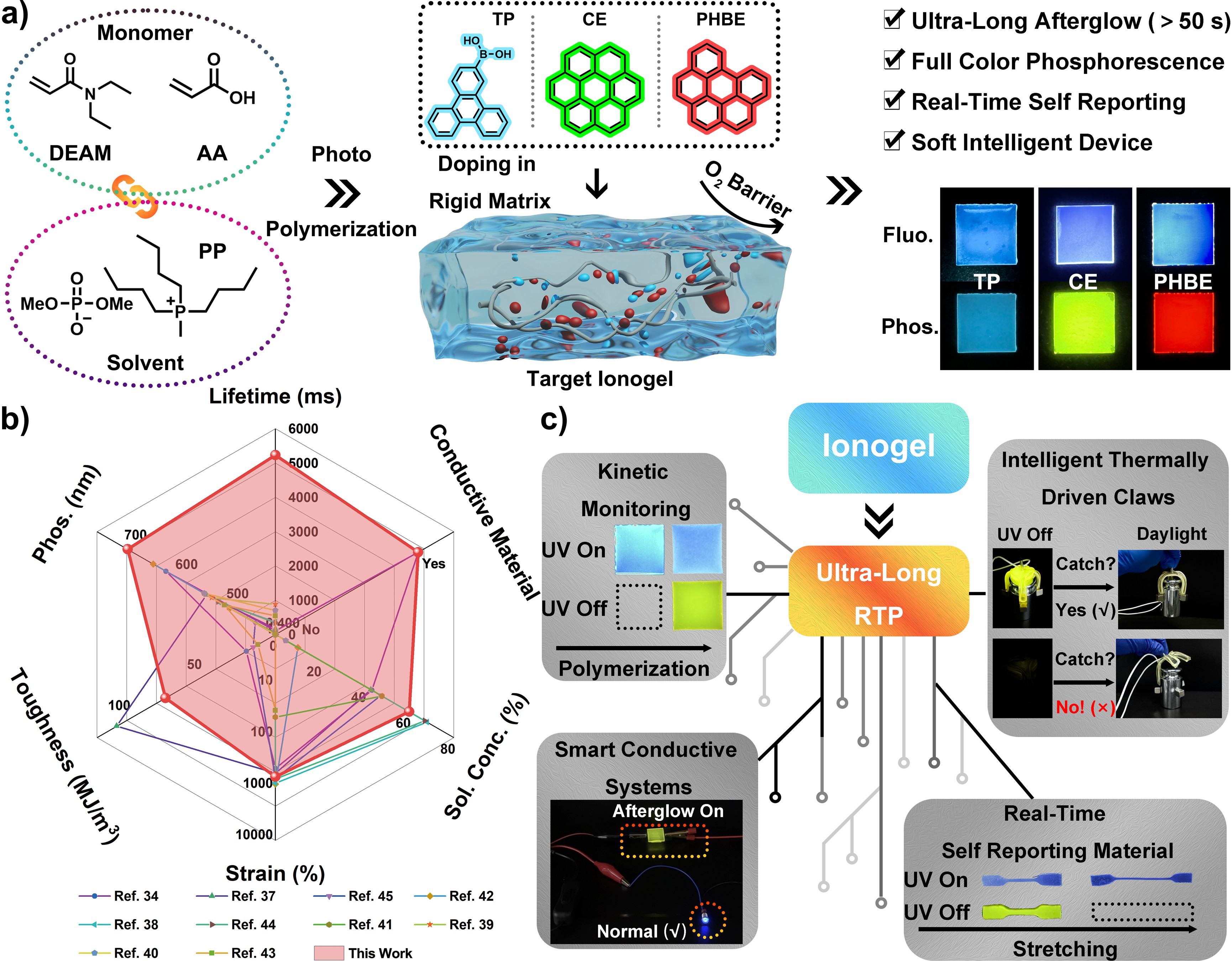 研究团队基于离子液体与富氢键聚合物单体之间的多级相互作用,成功构建了一系列具有超长室温磷光发射的柔性离子凝胶材料。实验结果显示,此类材料在富溶剂环境下兼具优异的机械性能和光学性能。具体而言,材料的最大应变伸长率接近1000%,最大韧性约为77.11 MJ/m3,在室温下可以表现出接近60秒的超长余辉发射,发光覆盖范围可从深蓝到近红外一区。