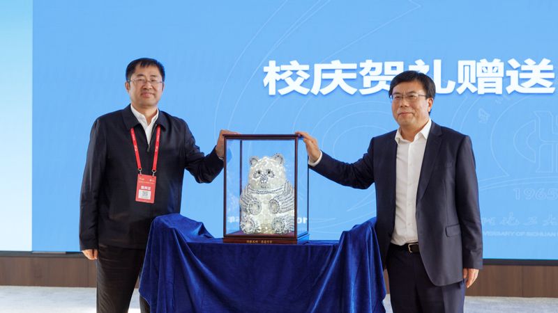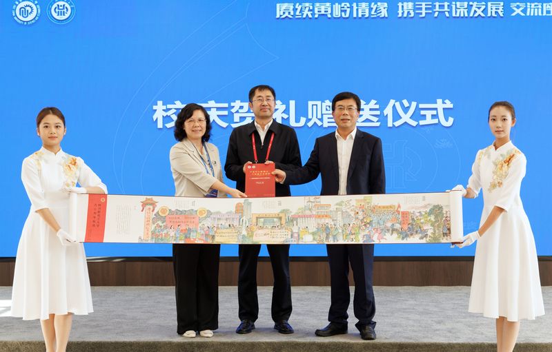 会上,蒋传海代表我校赠送校庆贺礼——由非遗连环画传承人罗希贤先生领衔创作、历时半年精心打造的6.52米长《千里初心映蜀山 六秩携手赴新程——“652工程”历史长卷》及配套画册。四川轻化工大学回赠了由其校友、自贡彩灯非遗传承人万松涛制作的瓷器手工捆扎技艺灯品国宝熊猫。它们不仅是两校友谊的象征,更是两校在服务国家战略和区域高质量发展的新征程上携手同行的历史见证。