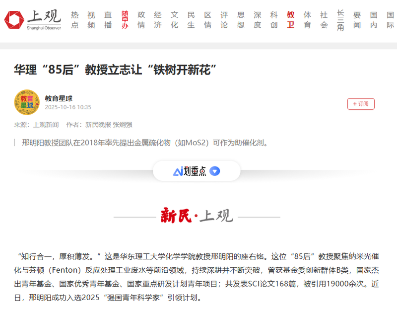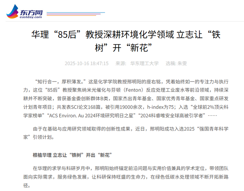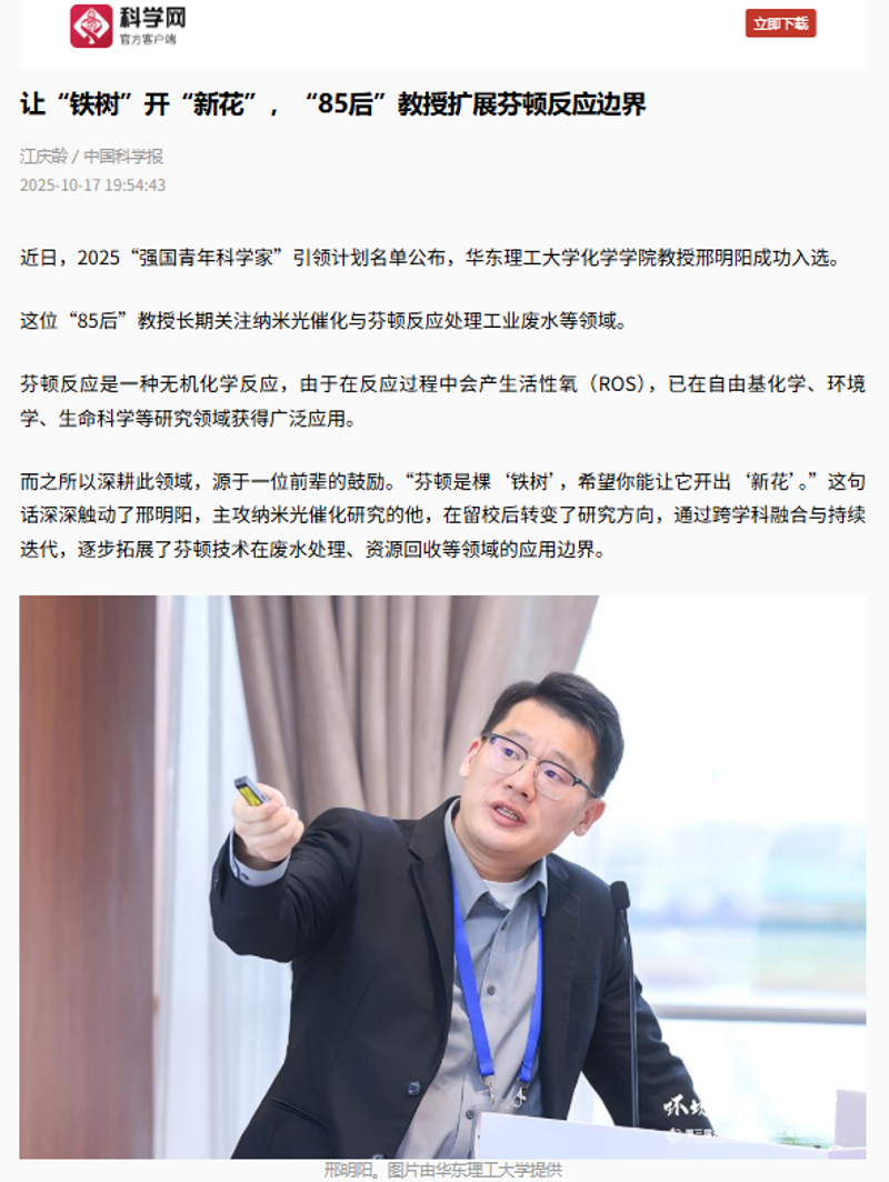 华东理工大学化学学院“85后”教授邢明阳聚焦纳米光催化与芬顿(Fenton)反应处理工业废水等前沿领域,持续深耕并不断突破,于近日成功入选2025“强国青年科学家”引领计划。科学网APP、新民·上观、东方网、青春上海、上海教育新闻网、上海科技报、话匣子等多家媒体进行了原发报道。本篇选取了部分报道予以转载。