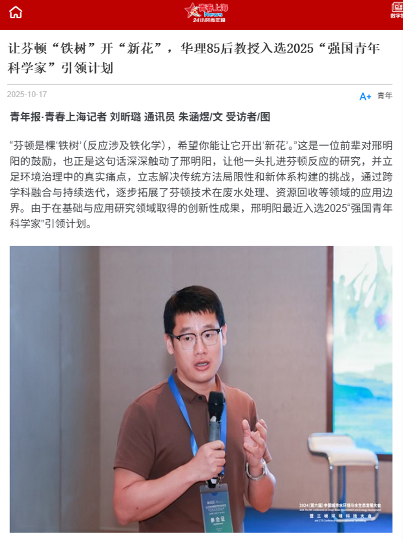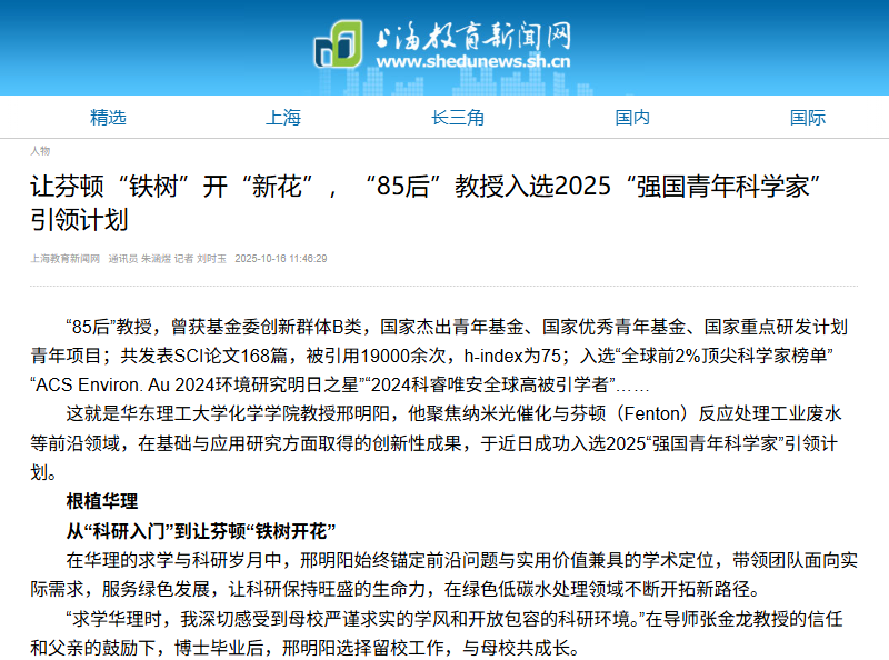【青春上海】让芬顿“铁树”开“新花”,华理85后教授入选2025“强国青年科学家”引领计划
