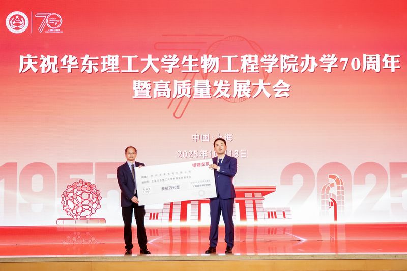 苏州沃美生物有限公司董事长、生物工程学院2020届校友滕小锘代表公司向生物工程学院捐赠300万元,用于支持学科发展、学生培养和国际交流等。院长叶邦策接受捐赠,并对企业的慷慨支持表示感谢。