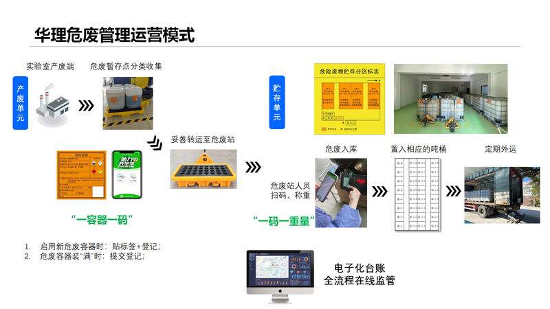 值得一提的是,华东理工大学还是上海市首个实现与市级固废管理系统深度对接的高校,危废从产生到外运的每一个环节都有“电子凭证”,真正做到了“校内校外两本账一致”,为危废管理的规范化、透明化提供了有力支撑。