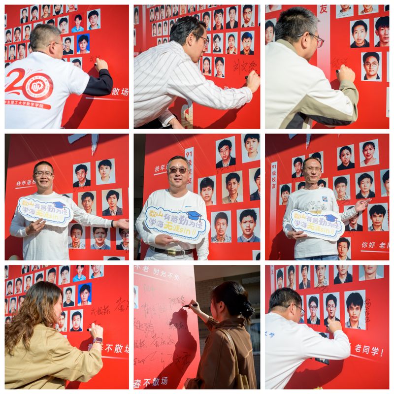 当天上午,校友们陆续抵达签到处,与照片墙上当年入学时候的自己合影。同学之间一声亲切的问候足以穿透数年未见的岁月,时间似乎回到大学校园的青葱时光。签到完毕后,校友们重游熟悉的林荫道、教学楼和图书馆,用脚步丈量校园的新变化,用镜头定格难忘的瞬间,往昔的求学岁月仿佛历历在目。中午,大家齐聚学生食堂,共进充满回忆的“爱校餐”。