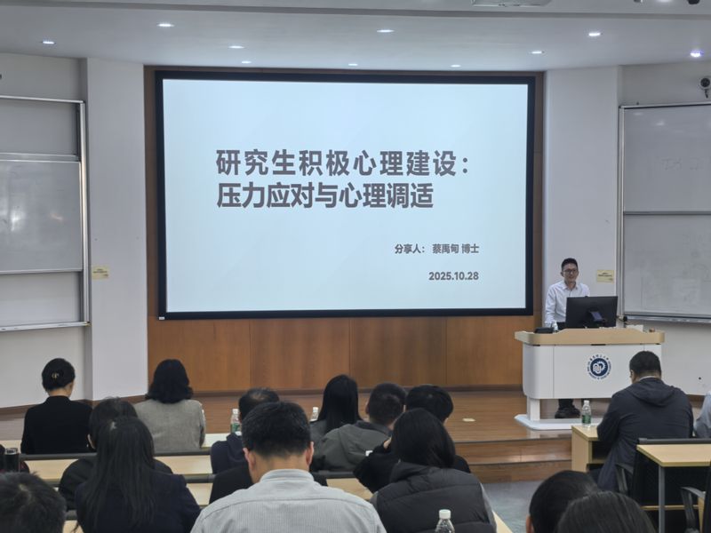 最后,学院还邀请了我校心理咨询中心蔡禹甸老师作“研究生积极心理建设:压力应对与心理调适”专题讲座。蔡老师向导师们介绍了当前国内高校学生的心理健康现状,并结合心理学相关研究与具体案例,系统讲解了导学沟通的技巧,并从积极心理学角度提供了可操作的压力管理策略和方法。