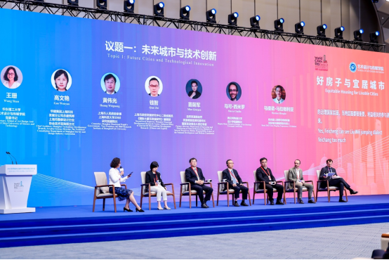 圆桌与互动交流环节分三个议题。第一议题“未来城市与技术创新”由华东理工大学艺术设计与传媒学院党委书记王珊主持,对话嘉宾包括华建集团上海科技发展分公司总建筑师兼上海市勘察设计行业协会技术咨询部主任高文艳,上海市人民政府参事、上海科技大学2060研究院副院长黄伟光,钱智,苗前军,西交利物浦大学设计学院副院长马可·西米罗,联合国人居署可持续发展目标城市(SDG Cities)旗舰项目负责人马提诺·马拉格利亚。与会嘉宾围绕“新动能与城市更新”展开深入探讨,认为城市更新应从“有形改造”走向“内涵提升”。在推动城市高质量发展的进程中,应以科技创新为引擎,以制度创新为保障,通过数字化治理、绿色建造和社区共治,激活城市空间的潜能,重塑城市的生活品质与人文温度。与会专家强调,城市更新不仅是建筑的重生,更是社会生态、文化传承与民生福祉的系统重构。
