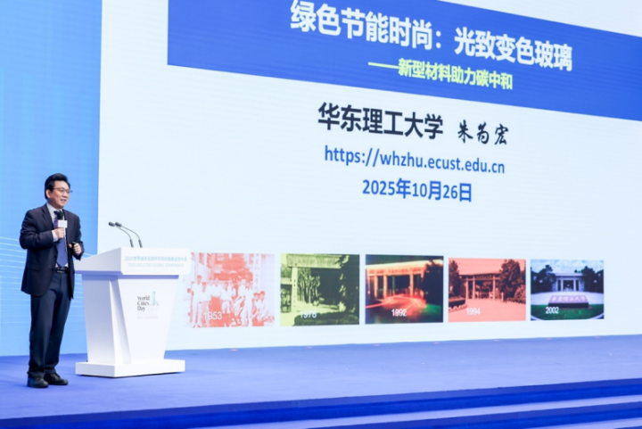 朱为宏以“绿色节能时尚”为主题做主旨演讲,介绍了华理在新材料领域的最新科研进展,提出科技如何为宜居城市添砖加瓦。他以最新的研究成果——光致变色玻璃为例,介绍了该材料在节能减排的同时又能赋予建筑更为时尚的外观,未来将在电动汽车、大型公共建筑等更多的场景中有所运用。