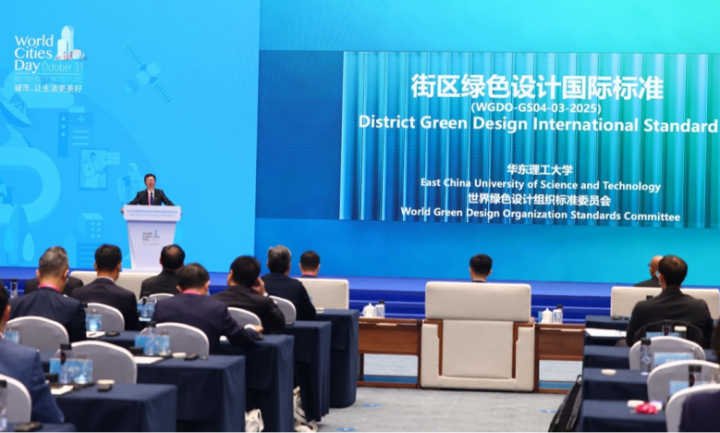 艺术设计与传媒学院院长汪军在全体大会现场介绍了该标准的编制过程和核心内容。该标准由世界绿色设计组织(WGDO)标准委员会发起、华东理工大学牵头多所国内外高校、科研院所及行业龙头企业联合编制,历时三年完成,是国际上首批面向街区全生命周期的绿色评估标准之一。标准以绿色环境、绿色设施、绿色治理及绿色技术应用为评价维度,融合ISO、联合国规范、欧盟标准、LEED及中国国标等现行标准的核心要素,构建涵盖空间规划、生态环境、碳中和适应等11个方面的系统指标框架。
