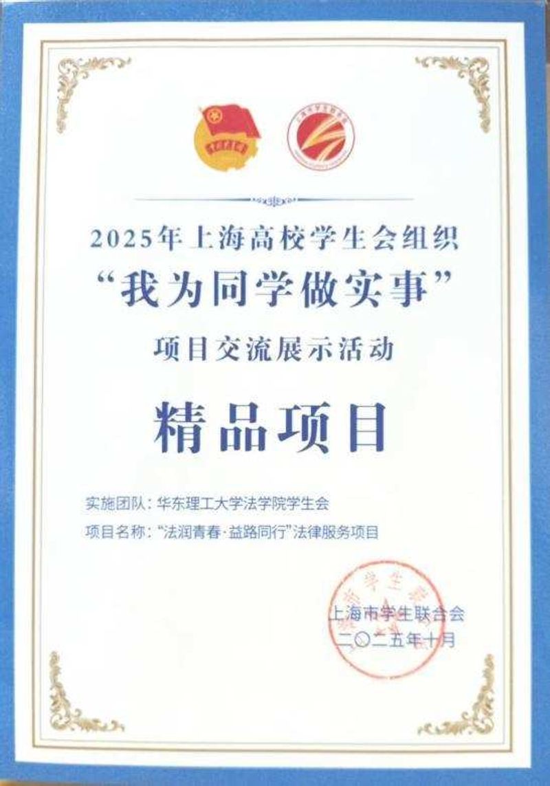 近日,2025年上海高校学生会组织“我为同学做实事”项目交流展示活动落幕。我校法学院学生会申报的“法润青春·益路同行”法律服务项目从全市众多参赛项目中脱颖而出,荣获上海市学生联合会“我为同学做实事”精品项目称号,全市仅7所高校学生会获此殊荣。这一成绩充分展现了华理学子服务同学、践行法治的青春风采,也是我校学生会深入推进“我为同学做实事”实践项目建设的重要成果。