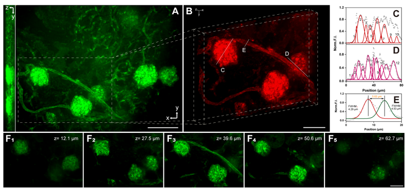 这类超吸收花菁染料具有高亮度、高稳定性、高生物相容性的特点,为高散射介质(如动物组织)的高分辨率三维成像提供了新工具。研究团队利用染料7对小鼠肾脏进行成像,不仅能区分皮质、髓质等大区域,更能精确测量出肾小球、肾小管壁乃至内部毛细血管的微观尺寸。并且通过三维重建,观察到的肾小球毛细血管网络和进出球动脉血管壁等精细结构。