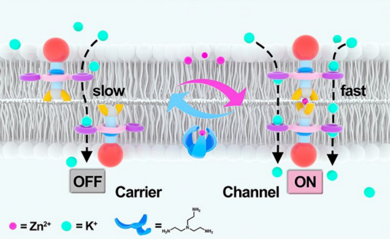 课题组在轮烷分子机器离子传输平台方面具有深厚积累,通过互锁组件的机械穿梭实现类通道离子传输,并系统提升了传输效率、离子选择性与光调控能力。基于此,本研究创新性地提出基于锌离子诱导轮烷二聚化的跨膜传输策略,通过三大核心设计要素的协同作用,成功实现了独特的双态切换功能:(1)不对称两亲滑杆设计:采用亲水四乙二醇头基与疏水锌螯合三联吡啶末端,确保分子在脂质膜中的精确定位与高效嵌入;(2)三环冠醚滑环结构:引入双苯并-18-冠-6-醚单元,增强钾离子选择性并提升单次离子通量,从而显著提高传输效率;(3)滑杆长度优化:将滑杆长度较传统设计缩短50%,为可控构象切换提供关键空间约束。研究显示,单体轮烷长度约2.40纳米,小于脂双层疏水区厚度(约3.0纳米),而二聚体长度可达4.67纳米,其更适于跨膜分布。在无锌离子状态下,系统表现为低活性载体;Zn2+配位后触发三联吡啶介导的二聚化,通过环组件沿滑杆的穿梭接力运动形成连续跨膜路径,实现高效离子通道功能。该系统还可通过Zn2+与三(2-氨乙基)胺(TAEA)的竞争结合实现完全可逆调控,其中TAEA可促使二聚体解离,恢复单体状态。这项研究首次在人工离子通道中,成功模拟了天然ZAC蛋白的“开关”机制,创建了第一个能用锌离子可逆控制通道传输的人工系统。