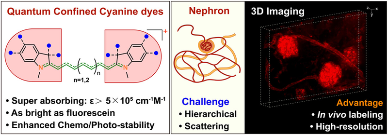 生命是一个三维的、动态的复杂系统。现代生物学与医学研究迫切需要能看清整个器官乃至活体内部的精细结构。波长超过800nm的近红外光,在生物组织中吸收少、散射弱,具有更大的组织穿透深度,是高精度活体成像的最理想的光谱区间。然而,现有近红外染料亮度低(摩尔消光系数×荧光量子产率),活体成像的分辨率低,同时近红外染料稳定性差,无法满足长时程活体成像需求。因此,领域亟待开发荧光亮度高、稳定性好的荧光染料。受限于能隙定律,近红外染料的荧光量子产率难以进一步优化。作者提出对近红外染料的摩尔消光系数进行强化,从而提升亮度。